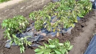 家庭菜園 じゃがいもに弾ポールで霜除け支柱を立てた