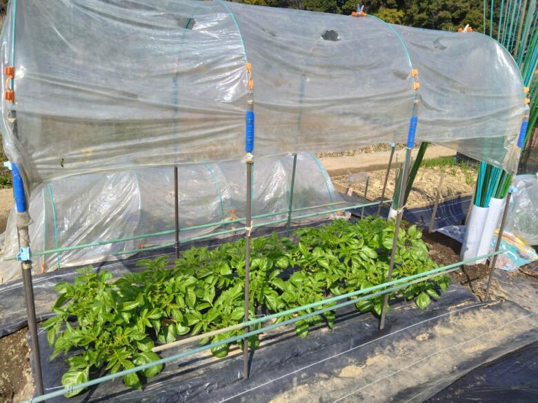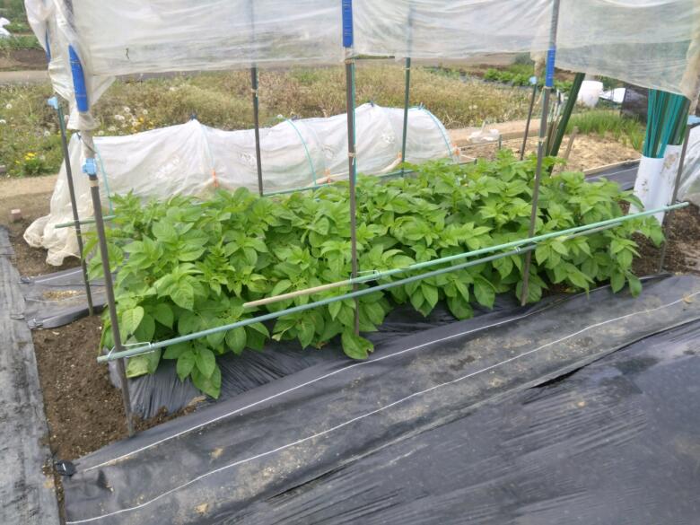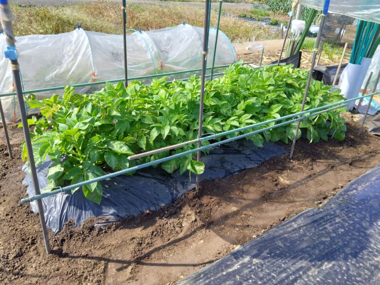 追肥も土寄せも、埋めたマルチの端を剥がして行いました